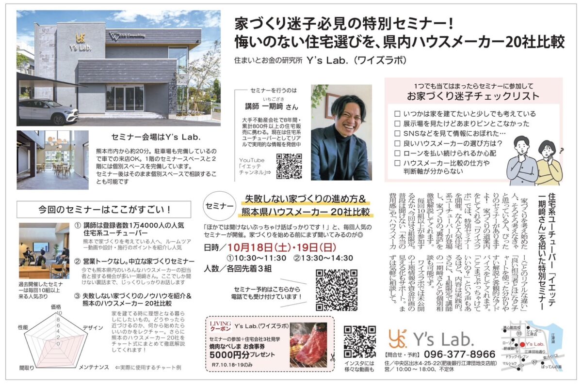 このたび10月11日付の「熊本リビング新聞」にて先月に引き続き、当社のイベントと取り組みについてご紹介いただきました。今回は住宅系ユーチューバーとして活動されていらっしゃる「イエッテチャンネル」の一期﨑さんを招いてのイベントに関する記事を掲載させていただきました。日頃から応援いただいております皆さまのおかげで、このような形で取り上げていただくことができました。